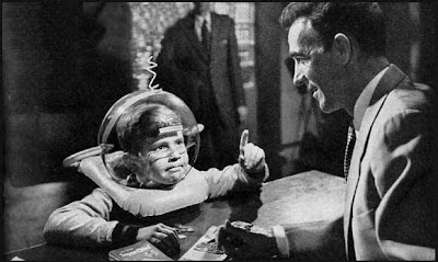 Vintage photo of space boy drawing a bead on a few ne'er-do-well space aliens while keeping his head comfortably pressurized thanks to the egg-helmet
